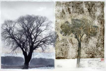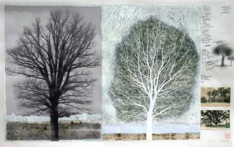 Back print, olej, pastele, grafit, colage